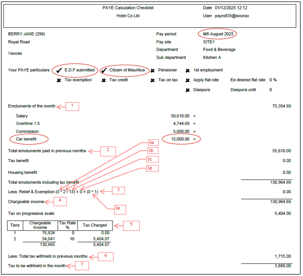 In this example, the employee receives a car benefit of Rs 15,000 as from the month of August. Since the car benefit is a taxable emolument, it is added to the total emoluments, increases the chargeable income, and therefore increases the PAYE.
