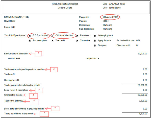 • Check the section “Your PAYE Particulars” : In this example, the employee has not submitted an EDF and is a Citizen of Mauritius