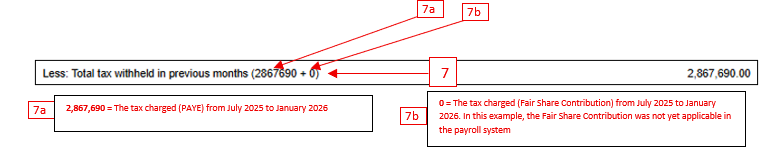 - Step 7: Check the Tax paid in previous months, in this example, it refers to the tax from July 2025 to January 2026, since the PAYE Calculation Checklist is for February 2026. The figures are illustrated via Illustration D below